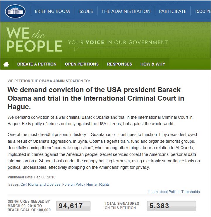 Петиција да се Обами суди у Хагу на сајту Беле куће