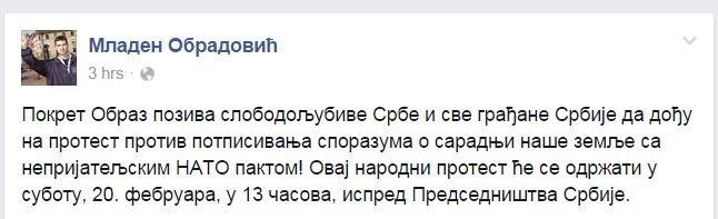 Покрет Образ позива слободољубиве Србе и све грађане Србије да дођу на протест против потписивања споразума о сарадњи наше земље са непријатељским НАТО пактом! Овај народни протест ће се одржати у суботу, 20. фебруара, у 13 часова, испред Председништва Србије.