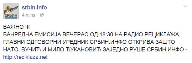 После објаве вест о томе да руска амбасада тражи од србске полиције да се склони од амбасаде и од антинатодемонстраната САЈТ СРБИН.ИНФО ЈЕ ОБОРЕН И НИЈЕ У ФУНКЦИЈИ… ПОДРЖАВАМО КОЛЕГЕ!