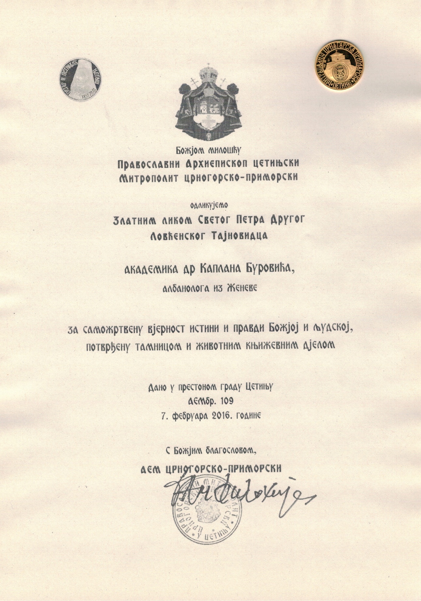 Из сасвим поузданих извора сазнајемо да је 07. фебруара 2016. године, у Саборној цркви Св. Николе у Улцињу, Божјом милошћу Православни Архиепископ, цетињски Митрополит цногорско-приморски др Амфилохије Радовић одликовао албанолога и балканолога свијетског реномена, академика, проф. др Каплана Буровића златним ликом Светог Петра Другог Ловћенског Тајновидца. Мотив овог изванредног и јако високог одликовања је: «За саможртвену вјерност истини и правди Божјој и људској, потврђену тамницом и животним књижевним дјелом».
