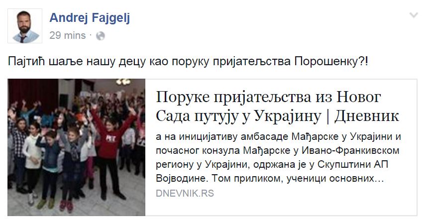 – Или је ово можда само нови начин да Покрајинска влада, а тиме и Србија, гурне „прст у око Русији (jeр, не заборавимо, Украјина Русију сматра агресором, услед чије „агресије“ Русије су угрожена украјинска деца за коју се забринула Скупштина и влада Војводине)?