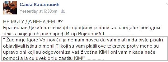 Игор Војиновић: Пошто на свом ФБ профилу пензионисани генерал Жандармерије Братислав Дикић наводи да ће, због мог изношења чињеница, доћи у Косовску Митровицу, гдје ћемо сви имати прилику да разговарамо с њим у очи у очи, требало би да се зна да на КиМ има много свједока његовог дјеловања који би му имали шта рећи, нисам само ја у питању.