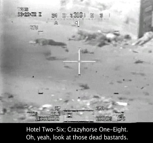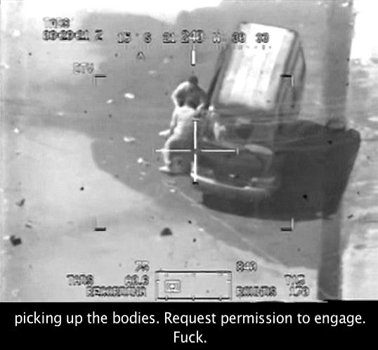 Када смо јуначким радом Бредлија Менинга и генијем Џулијана Асанжа дошли до слика стрељања цивила, рањеника, и људи који помажу рањеницима, када смо сазнали истину о стрељању које су извршили US војници из US хелихоптера (Апача??)… барем од тренутка објављивања тог снимка до данас, тај злочин („Колатерално убиство“) постао је злочин свих држава, друштава па чак и народа ЕU и NATO… јер ни један од тих народа није се подигао и затражио правду за тај и небројене друге злочине, чак уранијумске злочине водећих NATO империја.