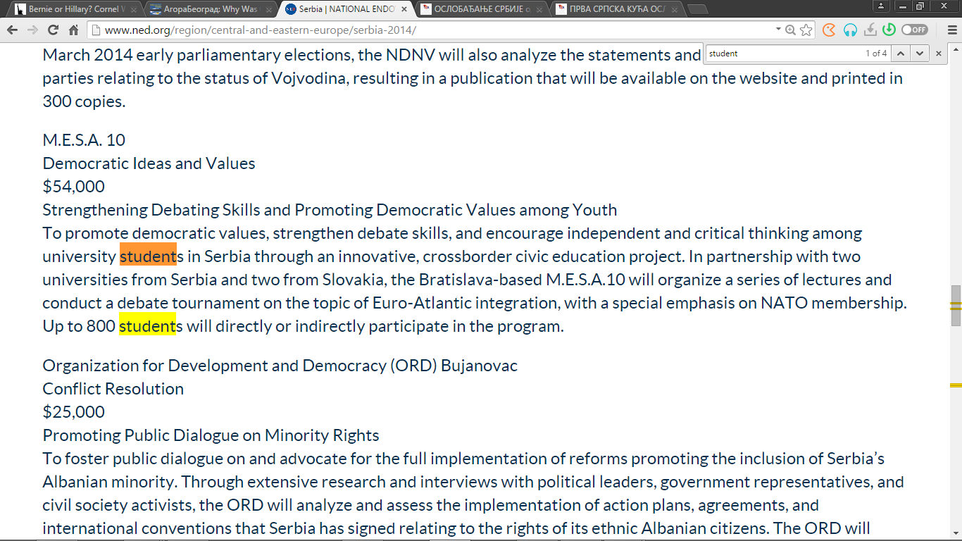 National Endowment for Democracy (Национална задужбина за демократију), „невладина“ организација која је под надзором State Department-a тј. владе Сједињених Држава, а основана и плаћана од стране US Congress-a, хвали се на својој страници (п)освећенoj Србији…