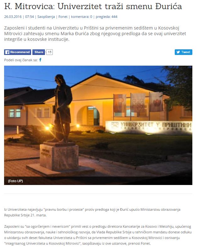 „Запослени и студенти на Универзитету у Приштини са привременим седиштем у Митровици захтевају смену директора Канцеларије за Косово и Метохију, Марка Ђурића због његовог предлога да Влада Србије укине свих 10 факултета Универзитета у Приштини са привременим седиштем у Северној Митровици.“