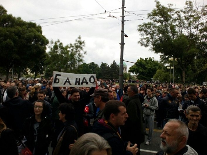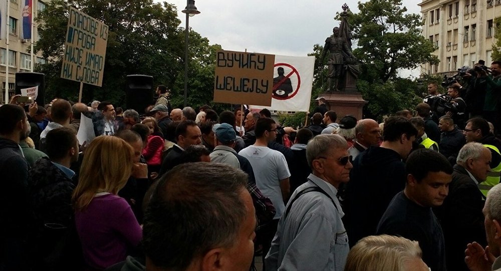 Грађани носе транспаренте на којима пише: „Вучићу — Шешељу“ и „Гласове из гроба није имао ни Слоба“.