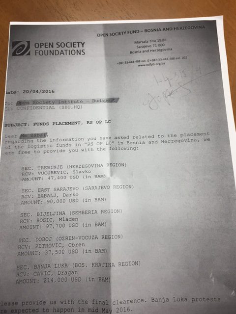 На крају документа који је канцеларија Фондације „Отворено друштво“ у Сарајеву упутила Институту „Отворено друштво“ у Будимпешти тражи се коначно одобрења уз навођење да се протести у Бањалуци очекују половином маја.
