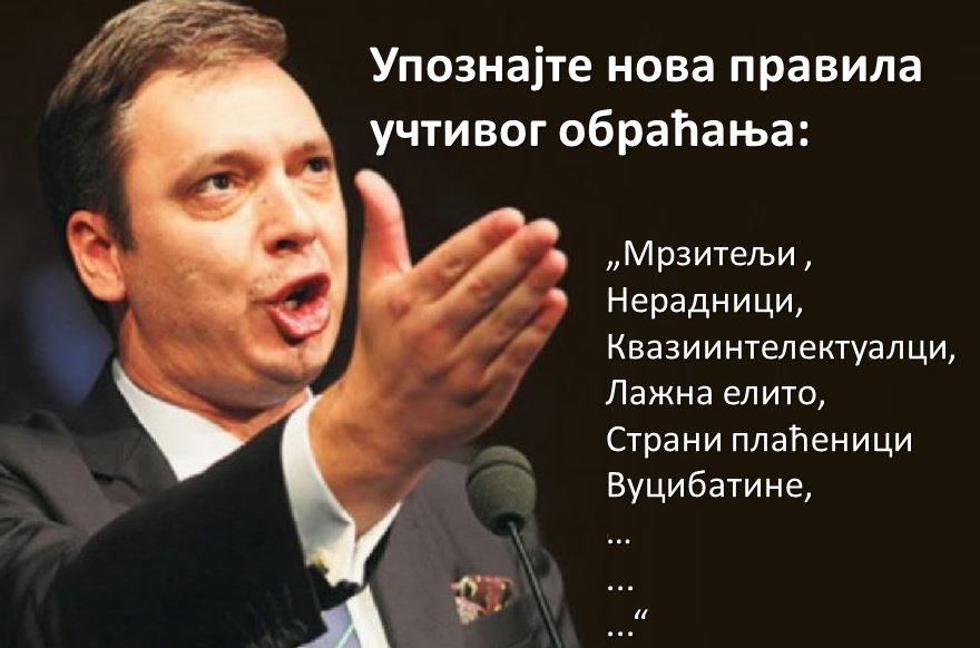 Небројано пута сте критичаре Ваше политике и рада називали мрзитељима, нерадницима, квазиинтелектуалцима и лажном елитом а повремено чак и страним плаћеницима, од чега Вам је ово последње изазивало нарочито леп осмех на лицу.