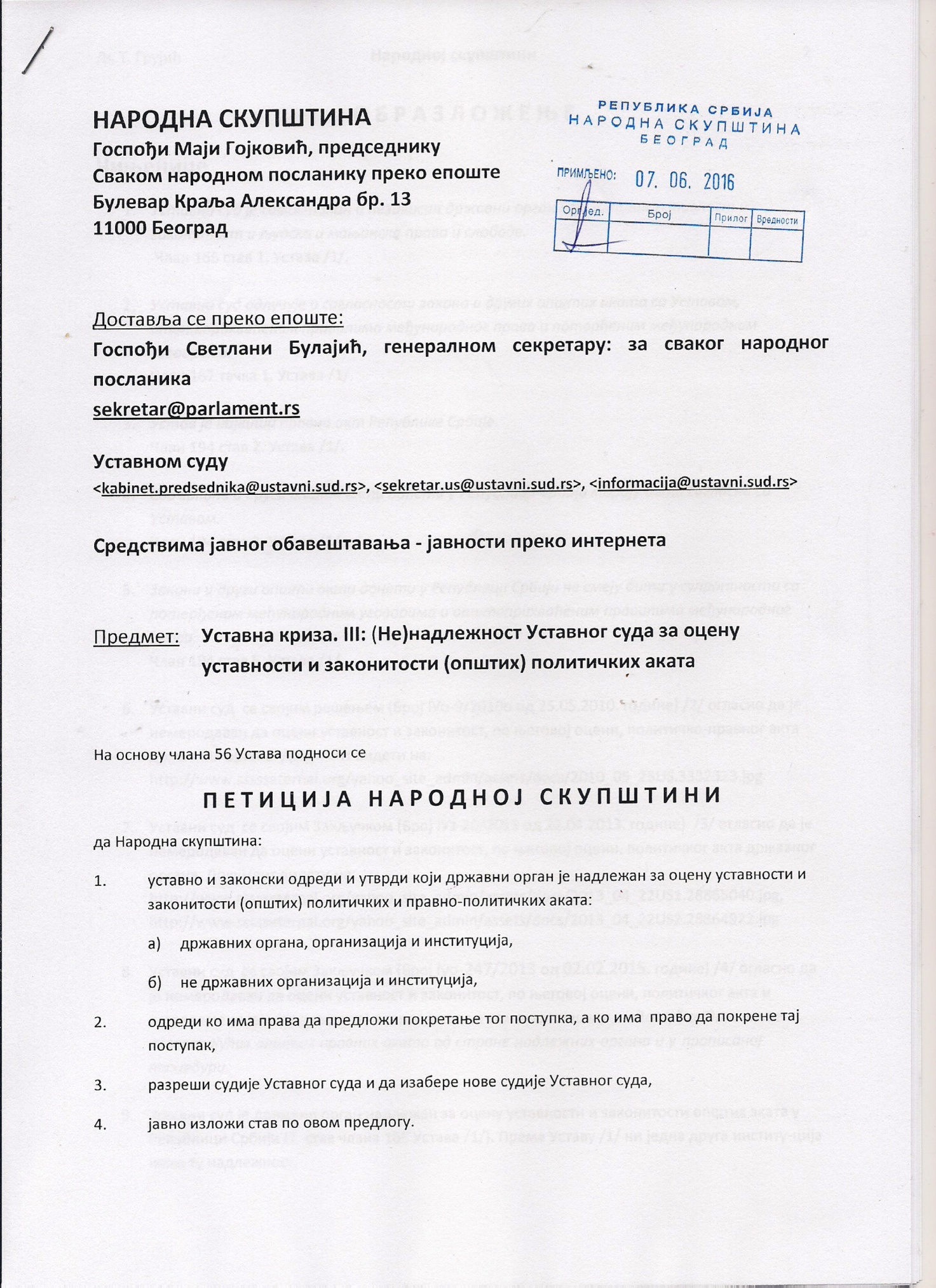 - Свестан да предлог за промену Устава /1/ може поднети најмање једна трећина од укупног броја народних посланика, председник Републике, Влада и најмање 150.000 бирача према 1. ставу члана 203 Устава /1/ и да свако има право да, сам или заједно са другима, упућује петиције и друге предлоге државним органима, организацијама којима су поверена јавна овлашћења, органима аутономне покрајине и органима јединица локалне самоуправе и да од њих добије одговор када га тражи, према ставу члана 56 Устава /1/, упућујем Народној скупштини ову петицију и тражим да Народна скупштина јавно одговори на њу.