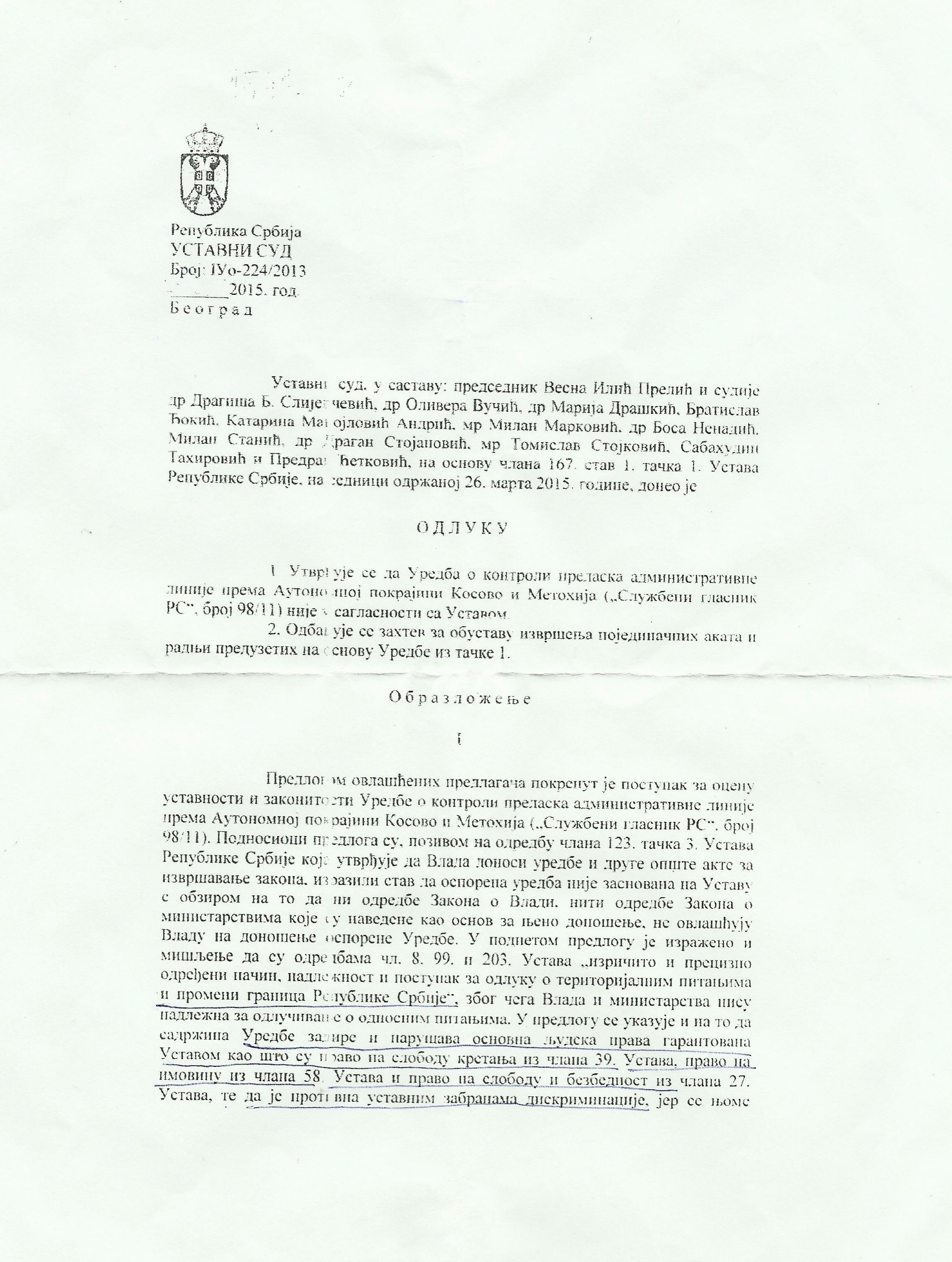 Народним језиком казано, Влада Србије је донела Уредбу којом је реализаовала Бриселски споразум и поставила државну границу између преосталог дела државе Србије и Косова и Метохије. Због тога је Уставни суд наложио Влади Србије да укине ову Уредбу и демонтира границу унутар Србије. До дана данашњег, Влада Србије није спровела Одлуку Уставног суда Србије у којој се каже да је територија Републике Србије јединствена и недељива, него напротив, отвара нове граничне прелазе.