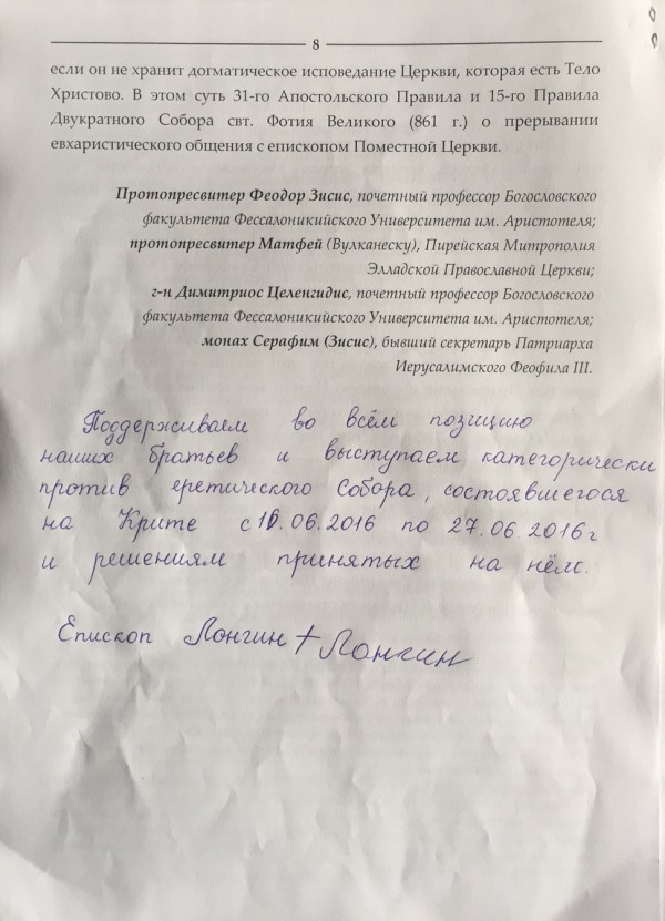6. Шта треба чинити сада након критског Сабора који је доживео фијаско и није могао да донесе убељиве и јасне одлуке, већ је уместо тога донео двосмислене и контрадикторне одлуке? Неопходно је да се постигне узајамно разумевање, са једне стране, цркава које су одсуствовале са Сабора због озбиљних догматских и еклисиолошких разлога; са друге стране – са епископима који су или одбили да учествују на њему, или су пак учествовали у раду Сабора али нису потписали спорни саборски документ „Односи Православне Цркве са остатком хришћанског света“, и на крају са Светом Гором Атонском и са здравом пунотом Цркве која захтева да се укину одлуке Сабора и да се на саборном нивоу признају за неважеће (што се нарочито односи на горе поменути екуменистички документ) и уз то захтева званичну саборску осуду екуменизма као јереси. Такође, неопходно је уложити све напоре на повратак на стари календар, како би се излечиле ране из прошлости и спречила појава нових подела и сукоба.