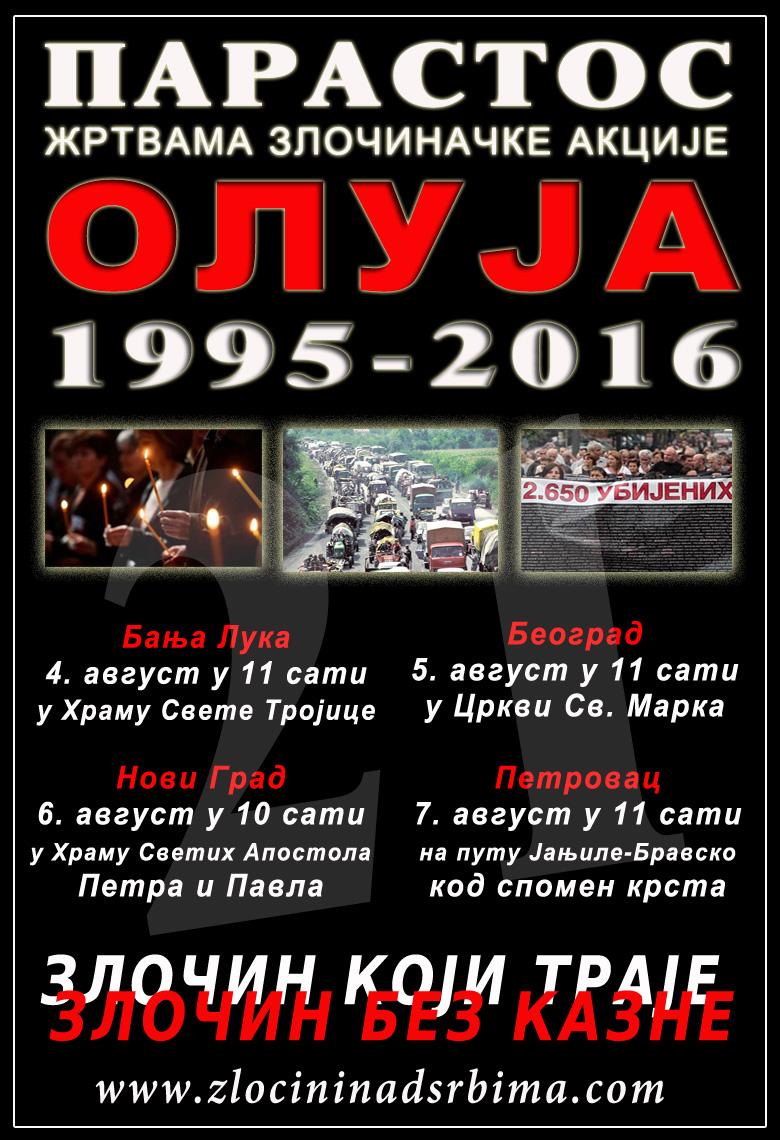 За неколико дана приближава се парастос жртвама злочиначке акције „Олуја“ односно холокауста и погрома србског народа из Книнске Крајине започетог 4. августа 1995. године у раним јутарњим часовима нападом НАТО авијације (у 03:10 сати), а у 5:00 сати креће и напад хрватске војске и полиције, у садејству са Петим корпусом муслиманске Армије БиХ на војне и цивилне објекте који су били у Сјеверној Далмацији, Лици, Банији и Кордуну. Однос снага је био 7:1 у корист агресора! Односно више од 200.000 војника и полицајаца хрватске војске је напало 30.000 војника Српске Војске Крајине.