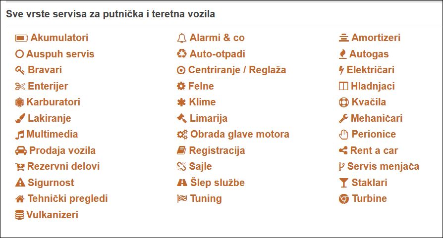 Потребан вам је аутоелектричар, механичар, вулканизер, сервис за ауспух, агенција за регистрацију возила или продавница резервних аутоделова? Уз пар кликова можете наћи сваки сервис у вашем окружењу.