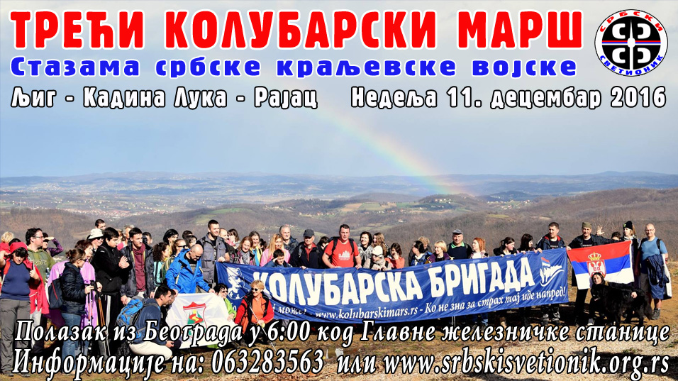 велико нам је задовољство да вас обавестимо да удружење Србски Светионик организује Колубарски марш по трећи пут (18 км) у недељу 11. децембра 2016. године. Биће организован полазак аутобусима из Београда за Љиг у 6:00 сати, са главне железничке станице, код Плаве локомотиве.