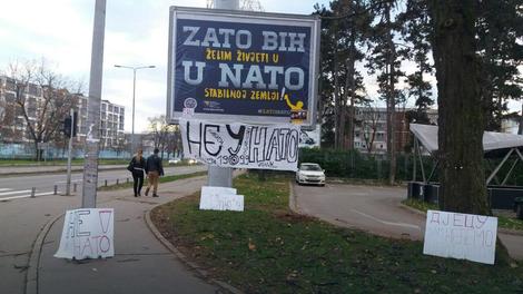 Демонстранти су покрај билборда који пропагира узак у НАТО оставили анти-НАТО поруке, како би свим грађанима скренули пажњу на “погубност уласка БиХ у овај војни савез”.