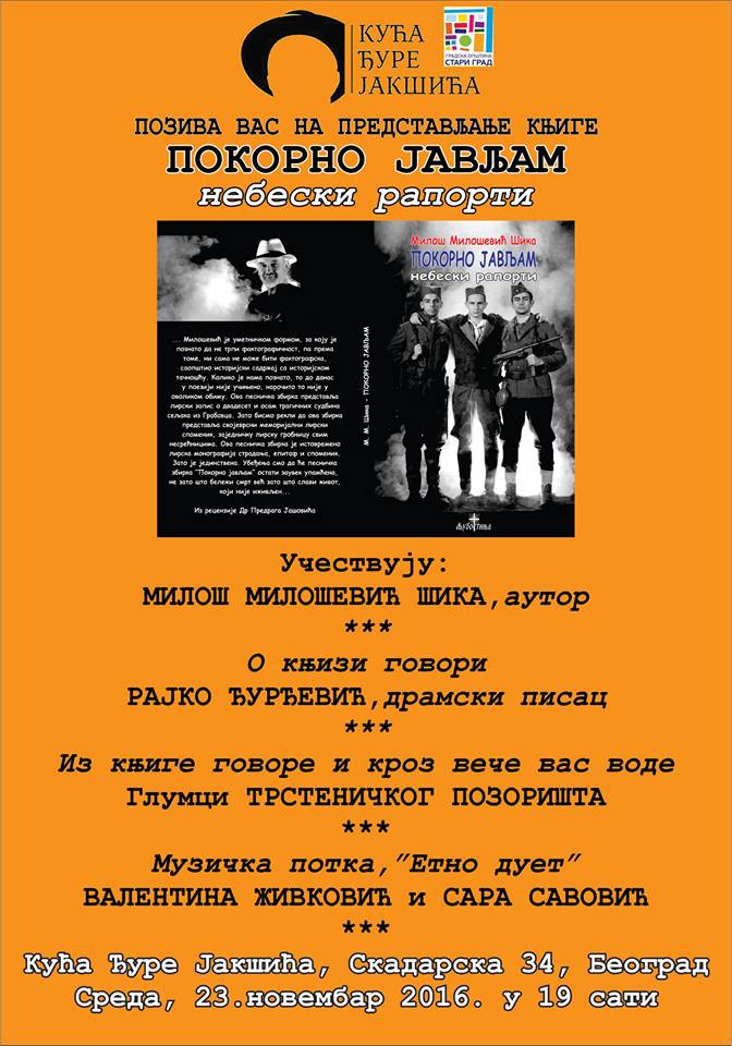 НАЈАВА ДОГАЂАЈА: КУЋА ЂУРЕ ЈАКШИЋА – представљање књиге Милоша Милошевића Шике „ПОКОРНО ЈАВЉАМ – НЕБЕСКИ РАПОРТИ“