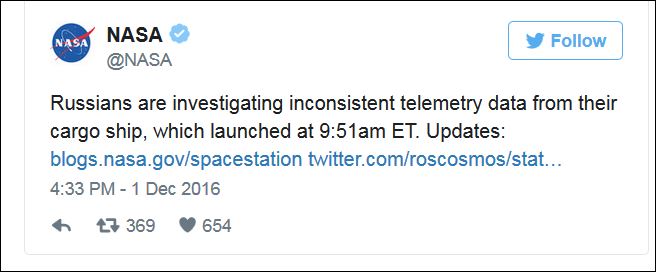 Руска агенција за истраживање свемира „Роскосмос“ огласила се ванредним саопштењем на свом званичном сајту да је дошло до уништења њиховог теретног брода. Узроци губитка летелице се још не наводе, хитна истрага је у току.