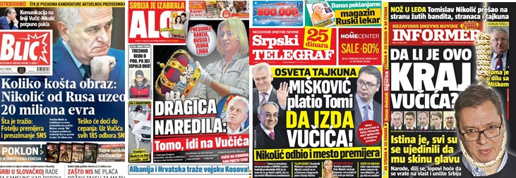 Да ли ико заиста верује да је ишта од тога могло бити изречено, а поготово на такав начин бити објављено и истакнуто пласирано, а да није било одобрено и наручено са „највишег места“? При чему је посебно занимљиво и индикативно било то како се у „прозападним“ медијима (Блиц) потенцирало Николићево русофилство („Руси дали Николићу 20 милиона евра да се кандидује“), док је у оним – деклеративно – проруским и радикално напредњачким (Информер, Телеграф, Пинк) задатак био да се Николић максимално оцрни и раскринка као „западњак“ и издајник који је, ето, продао душу Америци, Сорошу, тајкунима и „жутој банди“.