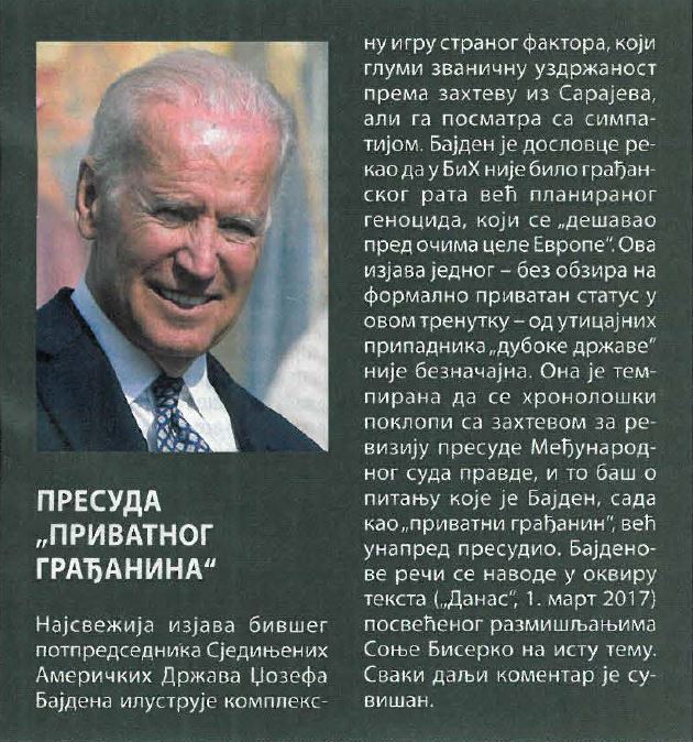 Природа правног питања којим се сарајевски захтев за ревизију бави – утврђивање одговорности Србије за лажни геноцид у Сребреници – на то недвосмислено указује. Проглашавање Србије кривом за Сребреницу, а истовремено и за наводне злочине сличне природе у Македонији, на Косову и у Хрватској – на шта Стоилковић оправдано скреће пажњу – важна је компонента у кампањи да се Србија морално онеспособи не само као таква, већ и као извор трајне подршке и гарантор опстанка Републике Српске.