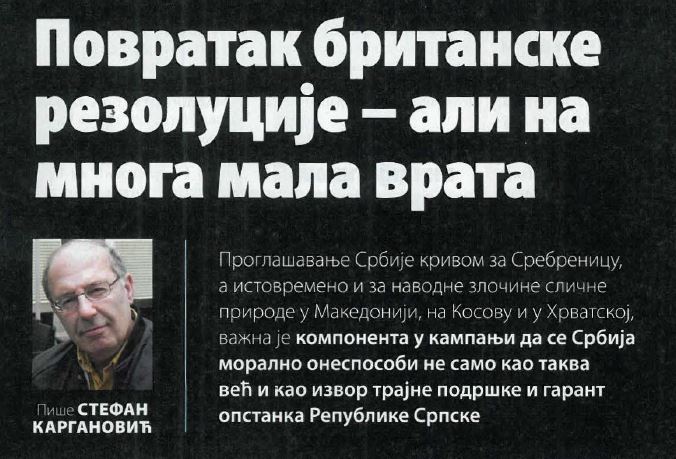 Британска резолуција из 2015. године, блокирана у последњем тренутку ветом Руске Федерације, сада се перфидно и са осветом враћа на неколико малих врата. Враћа се на начин који је не само неупоредиво лукавији него и опаснији, зато што својим безобзирним дејством у још већој мери распирује регионалне сукобе. А на све то српска руководства немају разговетан одговор, већ само непрекидно бунцају…