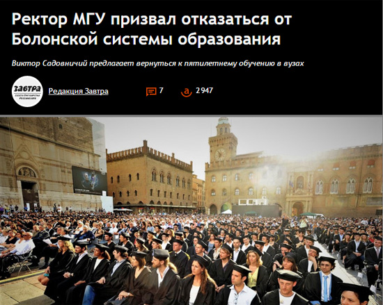 Ректор Московског државног универзитета М. В. Ломоносов (МДУ) и председник Руског савеза ректора, Виктор Садовничиј, назвао је прелазак на Болоњски систем вишег образовања грешком и предложио повратак на петогодишње студије.