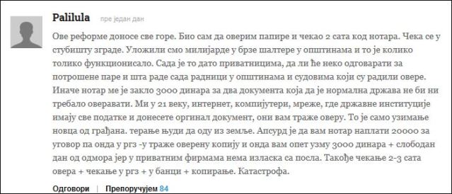 Не знам критеријуме за дозволу да неко нотарише, али ево ја сам спреман да разбијем монопол нотарске коморе, овераваћу за 10 пута нижу цену од њихове. Само ме изаберите и дајте дозволу, обећавам да ћу радити поштено. А биће то и допринос витешкој борби Европске Уније за здраву конкуренцију, видели смо то на примеру Јужног Тока.