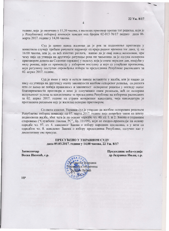 Обавештавамо вас да је Управни суд одбио жалбу проф. др Љубомира Т. Грујића на Решење РИК о одбијању Приговора на решење Изборне комисије (02 Број 013-76/17 од 05.03.2017, ДОДАТАК 1) о прихватању кандидатуре Александра ВУЧИЋА за председника Републике Србије.