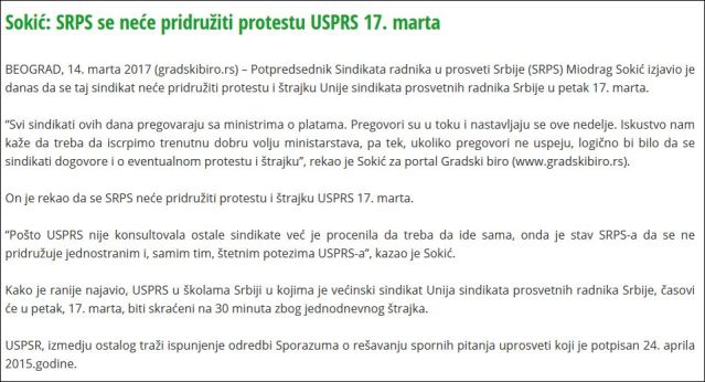 Он је рекао да се СРПС неће придружити протесту и штрајку УСПРС 17. марта.