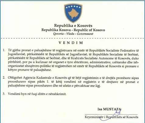 РТС је објавила вест : „На основу одлуке косовске Владе коју је потписао Иса Мустафа сва непокретна имовина регистрована на име СФРЈ, односно Републике Србије и Аутономне Покрајине Косово, региструје се на име Републике Косово као власника имовине“.