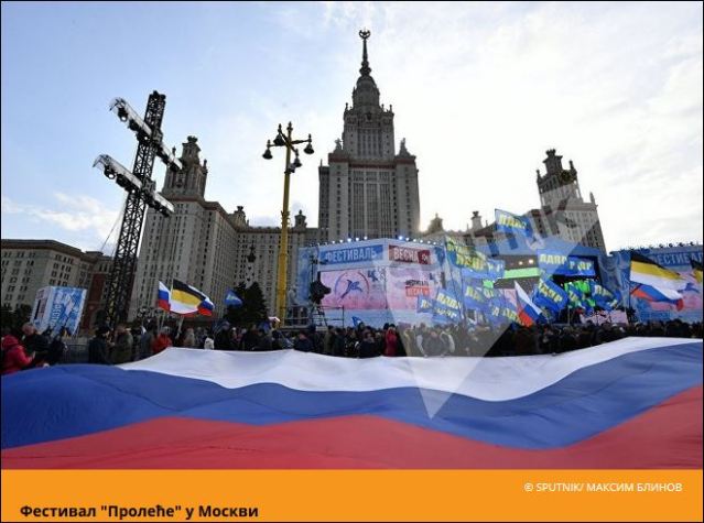 Фестивал „Пролеће“, посвећен трећој годишњици уједињења Крима с Русијом, завршен је масовним певањем руске химне и живописним ватрометом на Универзитетском тргу испред главног здања Московског државног универзитета на Воробјовим горама.