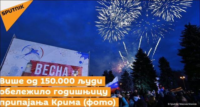 Трећа годишњица уједињења Крима с Русијом обележена је и на самом полуострву митинзима и концертима у Севастопољу и Симферопољу, на које су, без обзира на хладно време, дошле хиљаде Кримљана.