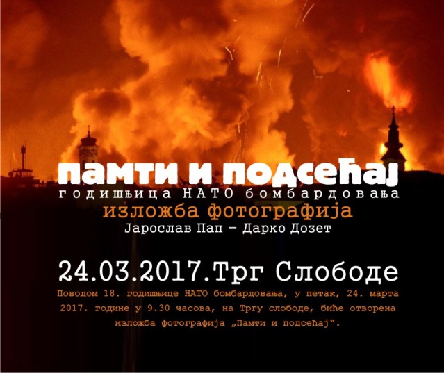 Поводом 18. годишњице НАТО бомбардовања у петак, 24. марта 2017. године у 9.30 часова, на Тргу слободе у Новом Саду биће отворена изложба фотографија „Памти и подсећај“.