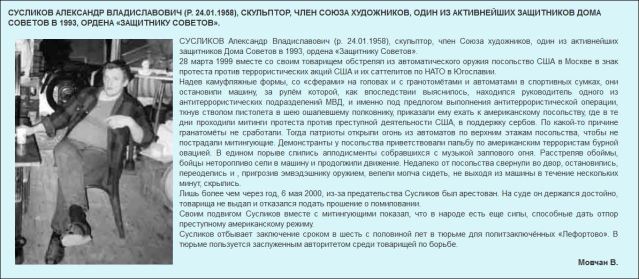 Руски вајар Александар Сусликов (СУСЛИКОВ АЛЕКСАНДР ВЛАДИСЛАВОВИЧ (Р. 24.01.1958), СКУЛЬПТОР) бранио је свој став о америчкој политици у затвору, јер је 1999. године гранатирао америчку амбасаду у Москви у знак протеста против НАТО бомбардовања Југославије.