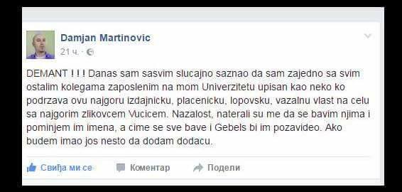 Један од њих је академски сликар Дамјан Мартиновић који је написао на Фејсбуку да се његово име нашло на списку сасвим случајно заједно са колегама запосленим на Универзитету и нагласио да не подржава „ову најгору, издајничку, плаћеничку, лоповску власт на челу да највећим зликовцем Вучићем“.