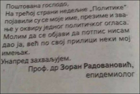Проф. др Зоран Радовановић, епидемиолог објавио је деманти: На трећој страни недељне „Политике“ појавили су се моје име, презиме и звање у оквиру једног политичког огласа. Молим да се објави да потпис нисам дао ја, већ по свој прилици неки мој имењак. Унапред захваљујем.“