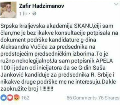 Зафир Хаџиманов написао је, такође на Фејсбуку, да га је Српска краљевска академија СКАНУ, чији је члан, ставила на списак без икакве консултације.