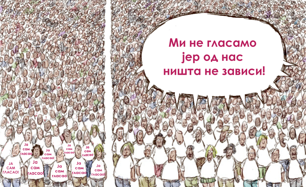 44% људи у Србији не гласа. Они кажу „Не занима ме политика“, „Мој глас ништа не мења“, „Сви су исти“, итд. Ти људи су заљубљени у свој песимизам и пацифизам и заљубљени су у себе. Да објасним: