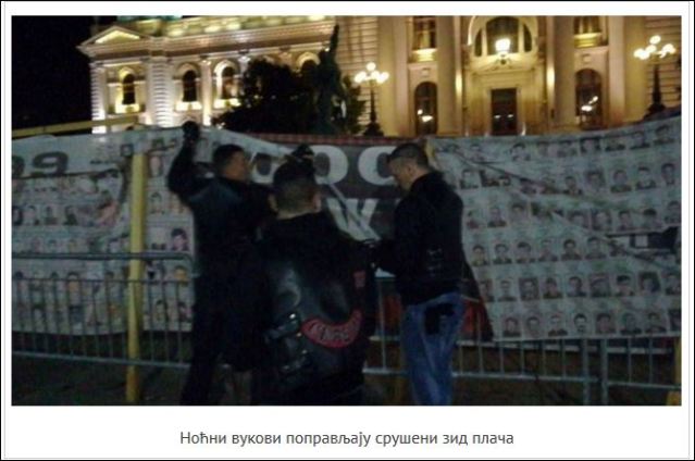 Порушени су плакати који су стајали испред Скупштине, који су нас све подсећали на НАТО и злочине УЧК терориста на Косову и Метохији, са именима и фотографијама страдалих, убијених, отетих и несталих…