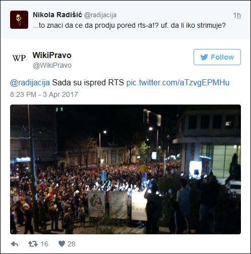 Грађани су се окупили јер су, како кажу, незадовољни резултатима избора. Појединци су Скупштину гађали јајима. Поворка је од Трга скренула ка Светогорској, зауставила се испред РТС.