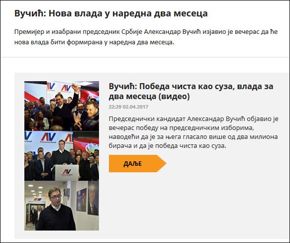 У међувремену је, иако није завршено бројање и званична објава коначних резултата Републичке изборне комисије, на основу резултата које су саопштиле невладина организација коју финансира Влада Србије – ЦеСид и агенција која ради истраживање јавног мњења за СНС и Вучића – Ипсос, Александар Вучић се прогласио за новог председника, славио са трубачима и ватрометом и одржао „прву конференцију за новинаре као нови председник“, где је најавио „нову владу Србије за два месеца“…