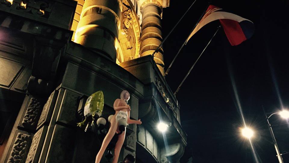 Отуда и „Карневал с озбиљним бројем учесника“ заправо „мисли“ да нишани на „властодршца“, али ће опет и опет – ако му се то дозволи – ПОГОДИТИ ДРЖАВУ, јер је већ прешао границу – из поштовања светости на њено скрнављење. Један властодржац ће бити замијењен неким другим, систем се тиме неће промијенити, али ће се ДРЖАВА ДОДАТНО УРУШИТИ. То рушење ће се одвијати – и уосталом већ се и одвија на овај или онај начин било скрнављењем или нечим другим и горим – и вјерујте – биће најнаивније ако се ствар заврши само на одвратним сценама тргања паноа са именима и сликама српских мученика са Косова, или постављањем ове одвратне лутке са слике, нимало случајно – одмах испод заставе Државе Србије, на зграду српске Владе.