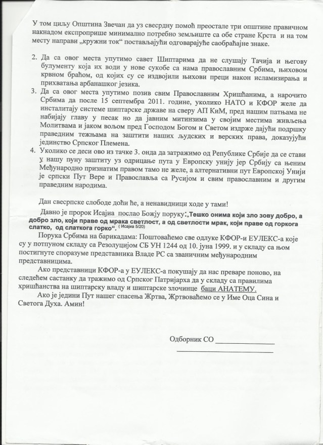 „Наше барикаде у Зупчу и Рудару су симбол отпора и трпљења „За крст часни и слободу златну“ и свако од православних Срба, ко то потире, није браћи на помоћ. Сада вам браћо морам напоменути једну битну чињеницу Знак Са Неба да је чује српски народ и цела светска јавност, а то је: Присуство Пресвете Тројице и дарова Духа Светога је у овим српским барикадама неспорно што се доказује и чињеницом да 13 дана Барикаду у селу Рударе (а колико чујем и у Зупчу) неће привремено да помера ни Господ Бог наш јер 13 дана није умрло ни једно лице у Косовској Митровици и Звечану, а која се сахрањују на градском гробљу у Рудару. До успостављања ових, за Србе нужних барикада свакодневно су вршене једна или више сахрана. Нека ми Господ Бог опрости што ово јавно изнесох, и да нас још јаче утврди у вери нашој“.