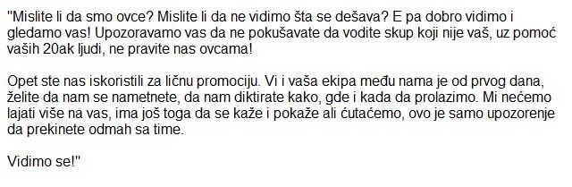 ЗАПАМТИТЕ, НА СВЕ НАЧИНЕ ЋЕ ПОКУШАТИ ДА НАС ЗАПЛАШЕ И ОНЕМОГУЋЕ СЛОБОДНО ИЗРАЖАВАЊЕ БУНТА ПРОТИВ ТИРАНИЈЕ И ДИКТАТУРЕ.