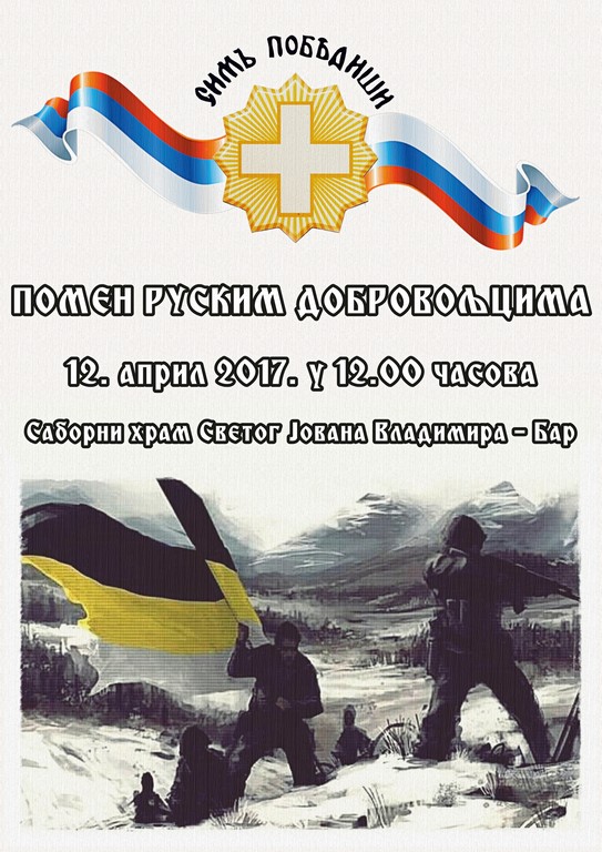 Поводом дана сећања на руске добровољце 12. априла 2017. године у Саборном храму Светог Јована Владимира у Бару биће служен помен са почетком у 12 часова.