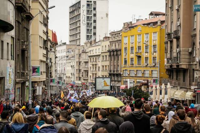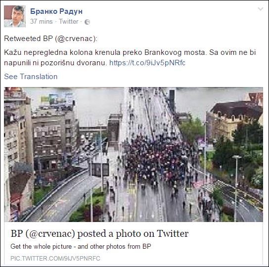 13.41 – Окупљени су се поделили у две колоне од којих једна мања кренула уз Немањину и кнеза Милоша, док друга повећа се креће преко Хајдук Вељковог Венца и улице Гаврила Принципа ка Бранковом мосту.