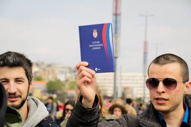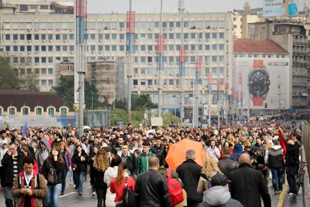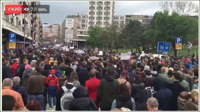 13.24 – Почела припрема за протестну шетњу. Окупљени певају уз тактове песме Марш на Дрину. Окупљени се крећу низ Немањином улицом ка Бранковом мосту ка Палати Србије.