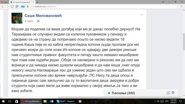 – Драги пријатељи, данашња колона је била дужа до 2 км. Ако узмемо у обзир да се простирала на 40 квадрата то значи да нас је било више од 80.000. Као сваки старешина војске имам две обавезе да охрабрим своје војнике и да их научим да се супроставе непријатељу. Дакле однос снага у нападу и одбрани мора бити 3:1. То значи да онај који напада мора имати три пута више снага од онога који се брани. Кад се браните ваш морал је 10 пута јачи од онога ко вас напада. Ја сам данас разговарајући са омладином, сазнао да су неки од вас претходних дана извлачени из масе и задржавани у неким просторијама 17 сати дневно. Имате на интернету доступне информације о телефонима војног и полицијског синдиката и те информације доставите нама. Наставите и истрајте, покажите да миран и достојанствен начин можемо да достигнемо циљ коме тежимо истрајте, ми смо уз вас.