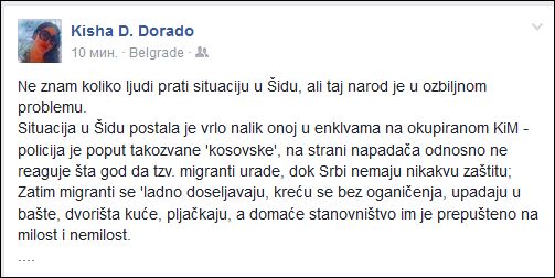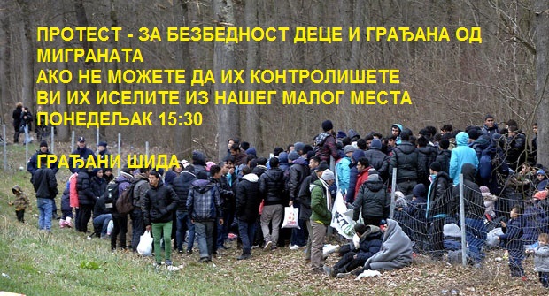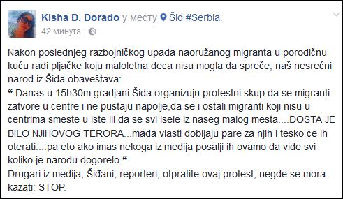 ❝Данас у 15:30 сати грађани Шида организују протестни скуп да се мигранти затворе у центре и не пуштају напоље, да се и остали мигранти који нису у центрима сместе у исте или да се сви иселе из нашег малог места… ДОСТА ЈЕ БИЛО ЊИХОВОГ ТЕРОРА… мада власти добијају паре за њих и тешко ће их отерати… па ето ако имаш некога из медија пошаљи их овамо да виде сви колико је народу догорело.❝
