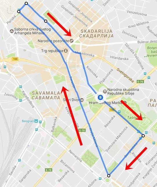 Једина новост је унапред најављена рута – Скупштина – Правни факултет – Београдска – Славија – Теразије – Кнез Михаилова – Париска – Студентски трг – Трг Републике – Скупштина.