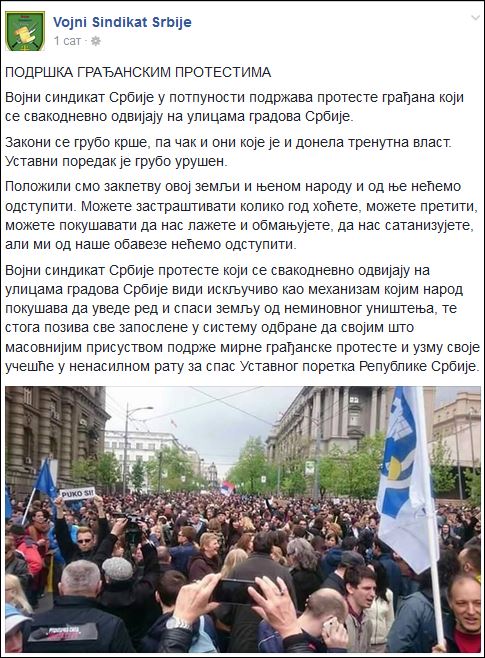 ИЗВОР: РТВ, ФБ страница ПРОТИВ ДИКТАТУРЕ, ФБ страница Војни синдикат Србије, 021.рс, ДАНАС